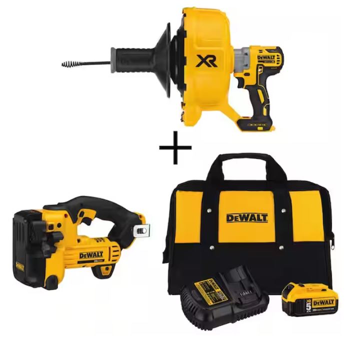 The Exclusive DEWALT 20V MAX Cordless Brushless Drain Snake, Cordless Threaded Rod Cutter, includes (2) 20V 5.0Ah Batteries, Charger, and Bag. Users value its cordless threaded rod cutting capability and the included batteries.